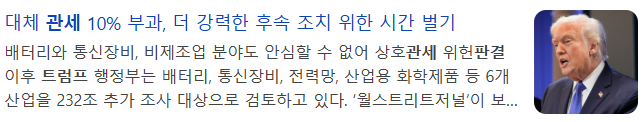 - 관세 정책 변동성 : 트럼프 대통령이 수시로 관세 정책을 변경하므로 뉴스 모니터링이 필수. 한 번의 트윗으로 시장이 급변할 수 있음
